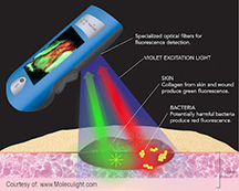 12/1/2021-clinicians are constantly in search for what provides us the most accurate quantitative data from the standpoint of non‐invasive safety. In the case of diagnosing cancers and bacterial infections, we are now exploring the potential of the intelligence behind bioluminescence and fluorescence (or autofluorescence) probes.From a 2019 study (by Raizman et al) about use of this technology (MolecuLight i:X) with debridement, scans of 22 wounds were conducted under standard and violet light in patients after debridement. Scans, performed non-invasively at the point-of-care, demonstrated remaining bacteria/biofilm signal in 100% of wounds after sharp debridement, triggering additional removal of tissue. (see intro feature review by Dr. Randall Weisel and Dr. Robert Bard)
