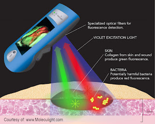 From a 2019 study (by Raizman et al) about use of this technology (MolecuLight i:X) with debridement, scans of 22 wounds were conducted under standard and violet light in patients after debridement. Scans, performed non-invasively at the point-of-care, demonstrated remaining bacteria/biofilm signal in 100% of wounds after sharp debridement, triggering additional removal of tissue. Fluorescence imaging is proven to have a four‐millimeter depth of diagnostic accuracy in the tongue or mucous membranes‐ similar to the cervix or the vagina or the intestine lining... and reports on its use in skin wounds and wound infection. However, it's use in skin diseases has not been fully explored. .(Article review) |