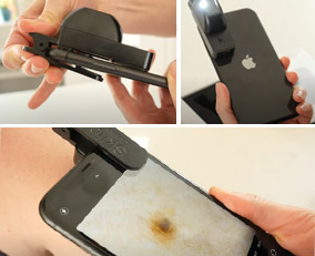 A dermatoscope is a tool that dermatologists use in-office to triage and diagnose skin cancers with confidence. SKLIP is developed as an easy-access and portable dermatoscope that attaches universally to any smartphone or in-office tablet or iPad. When properly aligned with your phone’s camera, the attachment allows your smart device to take images of your patient’s moles with higher clarity, magnification, and analysis tools. These photos can be used to supplement your virtual dermatology care, allowing you to provide the highest quality images thus improve your ability to evaluate potential skin cancers, including melanoma. For easy sharing between patient and dermatologist or collaboration between clinicians, SKLIP is the ideal and affordable scanning, saving and sending tool for questionable skin disorders...” (See SKLIP Intro | See Dr. R. Kline's Review) |